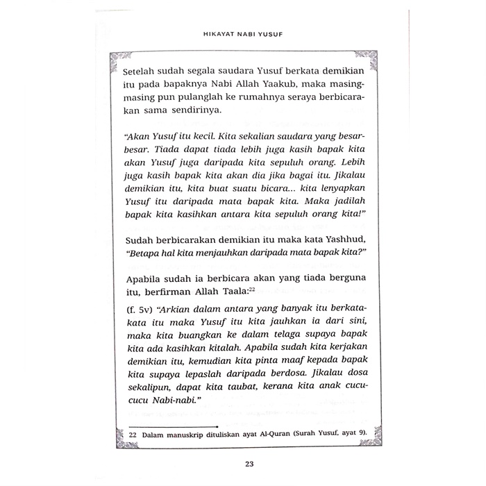 The story of Prophet Yusuf. indeed famous as found in the Quran and Christian and Jewish books. In addition, this story also seems to try to adapt the setting of the story to the local atmosphere such as rice as food and tigers instead of wolves.