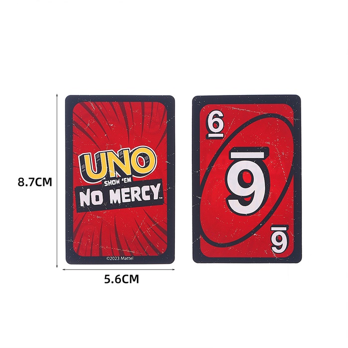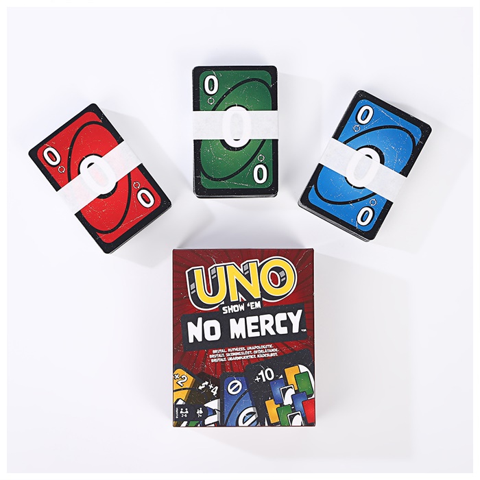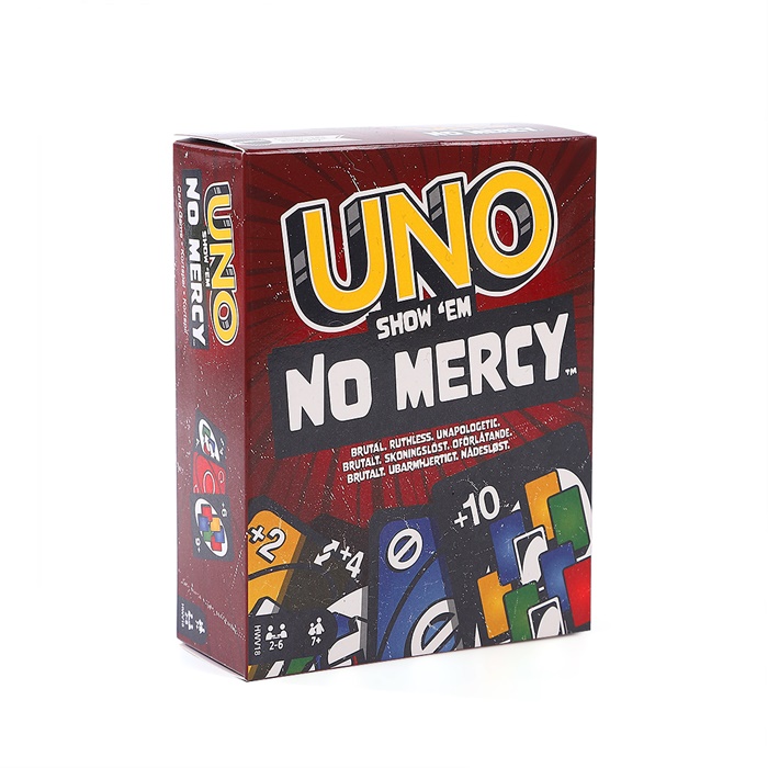 UNO Show 'Em No Mercy membawa permainan UNO klasik ke tahap seterusnya dengan permainan yang lebih kejam! Menampilkan 56 kad tambahan, penalti yang lebih keras dan peraturan tindakan melampau, edisi ini direka untuk mereka yang sukakan persaingan sengit.