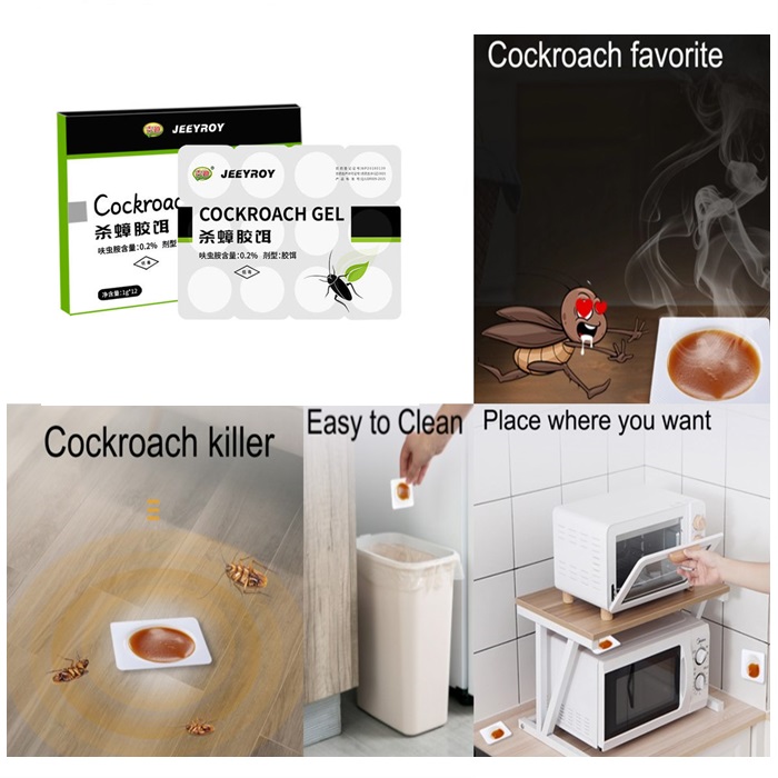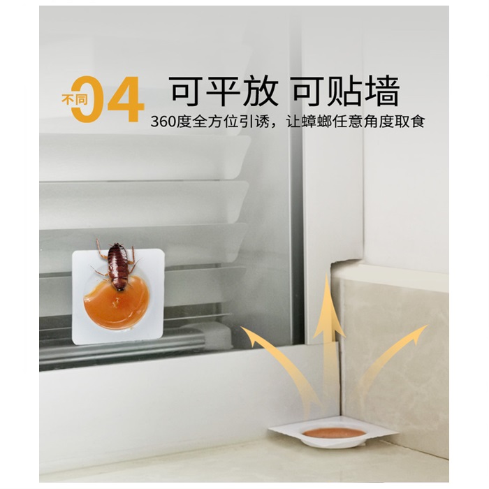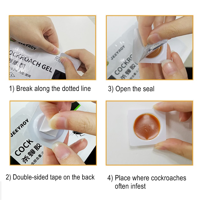 每个胶饵有效面积为1平方米。取下盖子。折断凝胶片,并去除底部的胶粘剂。将其固定在蟑螂可移动的地方,例如:冰箱底部,厨房的角落和缝隙,计算机底部,热水器后面,计算机和电气设备后面,浴室洗手池的底部,电视和任何其他热源的后面。