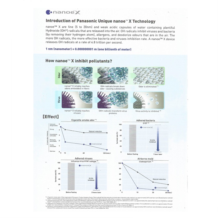 Nanoe™ ialah zarah air halus (5 hingga 20nm) yang mengandungi banyak radikal hidroksil. Peranti nanoe™ mengeluarkan zarah air ini untuk menghalang virus, bakteria, bau dan alergen dengan berkesan. Teknologi nanoe™ X boleh membawa faedah luar biasa ini di dalam rumah supaya permukaan keras, perabot lembut dan persekitaran dalaman boleh menjadi tempat yang lebih bersih dan menyenangkan.