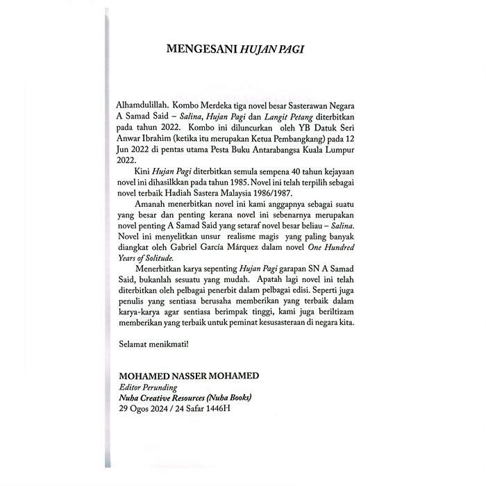 More than a personal story, Morning Rain incorporates elements of legend, history, archaeology, astronomy and politics. Each element is not just a setting, but becomes a stage for a debate of ideas between old and new values. Wrapped in the style of magical realism a la Gabriel García Márquez, this work is also a sharp critique of the infiltration of power in the media world — a world that is close to A. Samad Said's own real experience.
