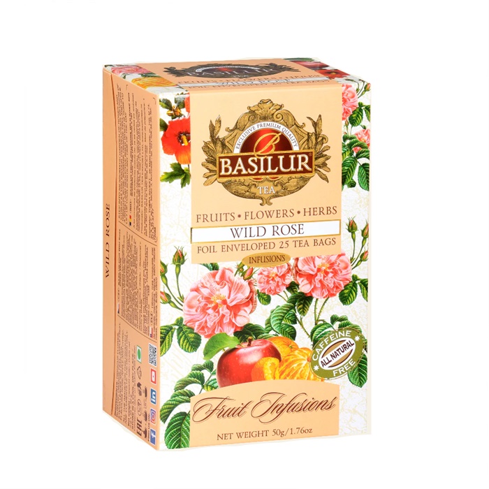 Teh buah tanpa kafein dengan nota semula jadi mawar, bunga raya, oren, epal, limau, stevia dan buah-buahan tropika serta tangerin.