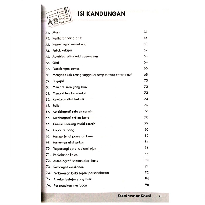 Buku ini merupakan edisi Bahasa Malaysia buku ‘100 Dynamic Essays Year 4,5 & 6’ yang ditulis untuk membantu pelajar UPSR sekolah rendah meningkatkan penguasaan Bahasa Malaysia dalam bentuk penulisan karangan. Pelbagai contoh karangan yang terdapat dalam buku ini dapat dijadikan sumber penjanaan idea bagi pelajar dalam proses pembelajaran mereka untuk menduduki kertas subjek Bahasa Malaysia Tahap 2 sekolah rendah. Bersama dengan versi Bahasa Inggeris, pelajar dapat mempelajari cara menulis karangan secara dwibahasa dan serta-merta medapat tahu maksud pelbagai ayat dan perkataan dalam Bahasa Ingerris dan Bahasa Malaysia pada masa yang sama. Glosari untuk perkataan susah disediakan.