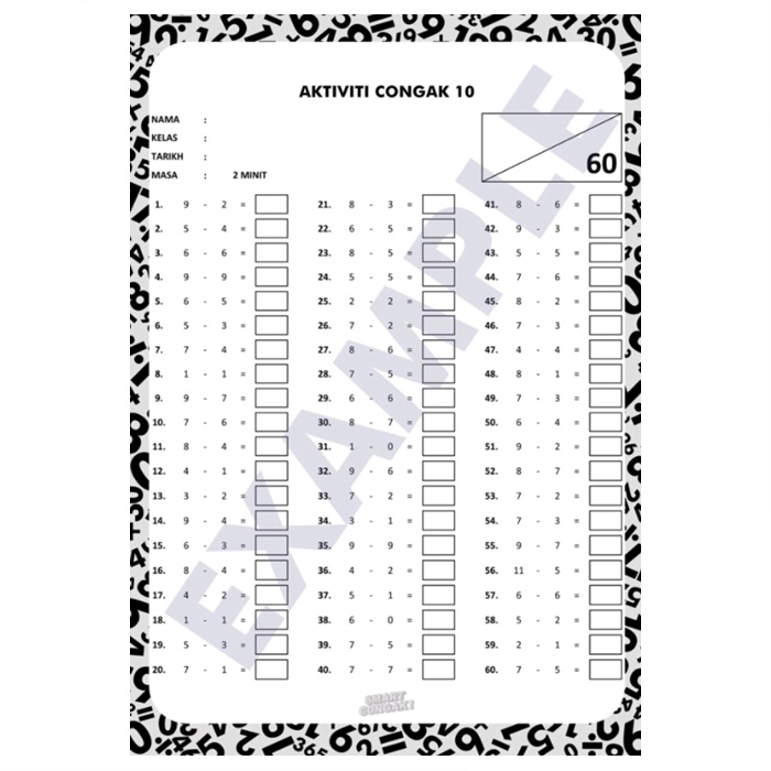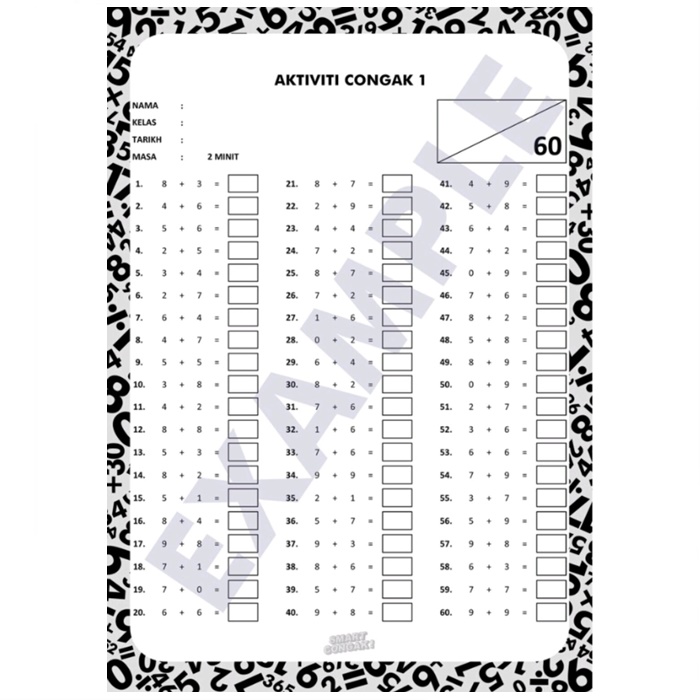 Buku latihan latih tubi dari SMART CONGAK! ini bertujuan untuk memperkenalkan kemahiran mencongak kepada pelajar tahun 1, tahun 2, dan tahun 3. Aktiviti di dalam buku ini mengandung 4 operasi asas matematik iaitu tambah, tolak darab dan bahagi. Buku ini mengandungi 39 aktiviti bersamaan dengan 2340 soalan mencongak. Buku ini sesuai untuk membantu pelajar untuk mengira dengan lebih cepat dan tepat.