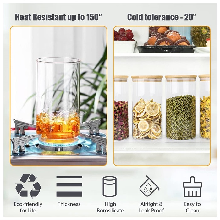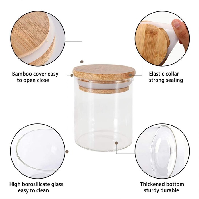 ✅Durable:Made of food-grade high borosilicate glass, high borosilicate glass is non-toxic and lead-free,100% no harm to human. Combined with durable bamboo lid, creating an ideal airtight environment for every thing you need!I think the bamboo lid is more environmentally friendly and healthy.