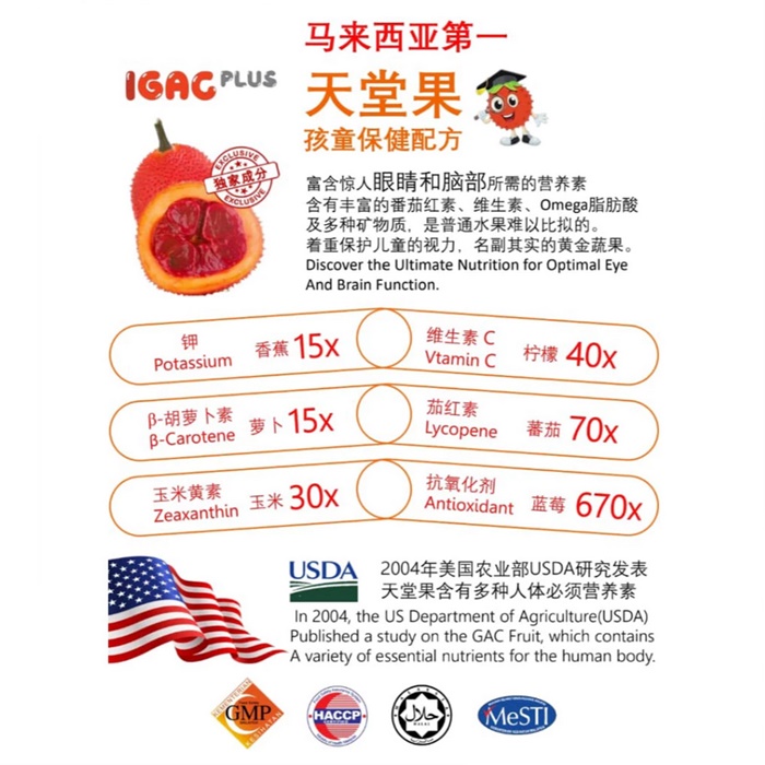 -Kesihatan Mata: Zeaxanthin dalam buah Gac melindungi retina dan meningkatkan ketajaman penglihatan, melindungi mata daripada cahaya biru yang berbahaya dan mengurangkan kerosakan jangka panjang.
