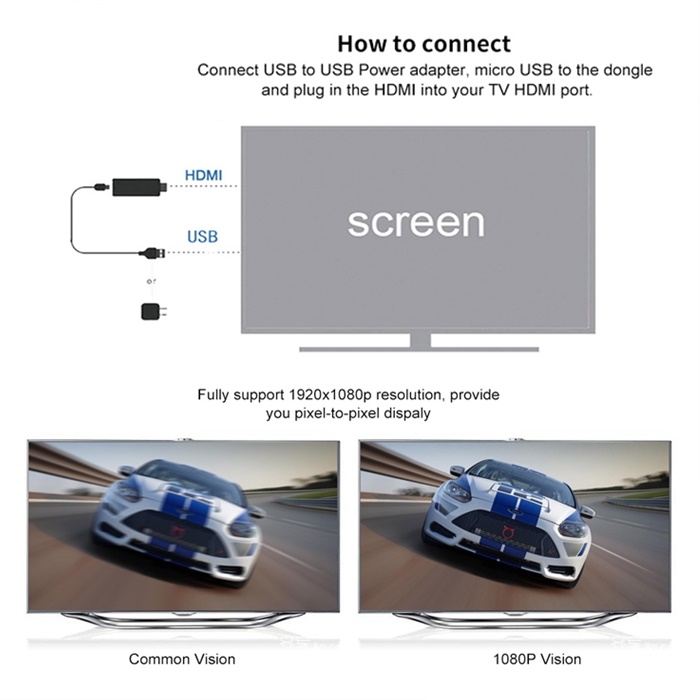 -MiraCast Mirroring: No need for mode switching. Enjoy media files on the large screen in just three steps: Plug > MiraCast > Mirroring.