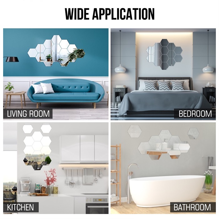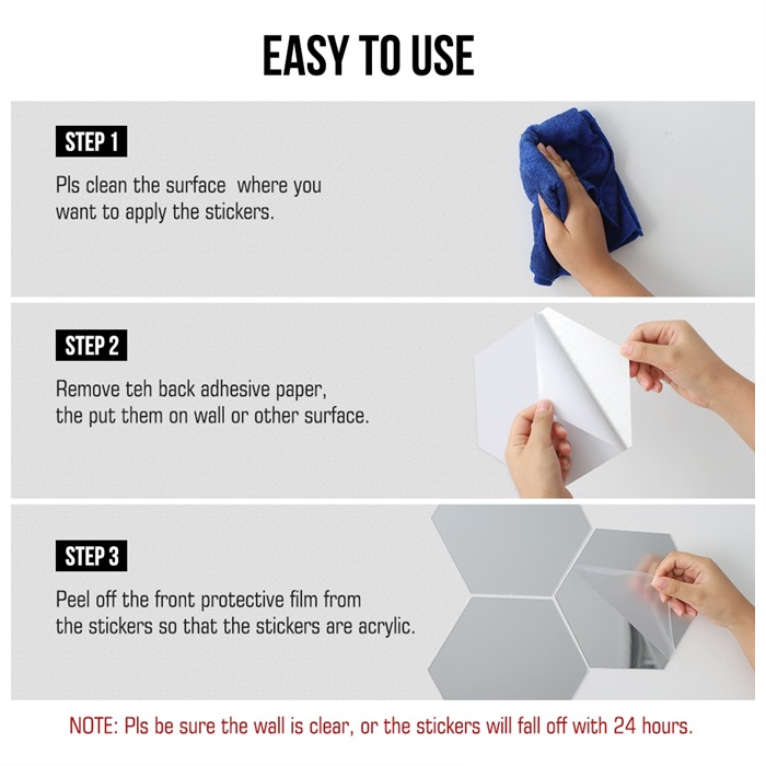 ?Sila Gunakan pada permukaan dinding yang bersih dan licin dengan bulatan melekat yang berasingan.dan dilindungi oleh filem pelindung yang jelas Untuk dinding tetapan TV, pameran dinding sofa, ruang makan, bilik tidur, peti sejuk beku, kabinet dan sebagainya.