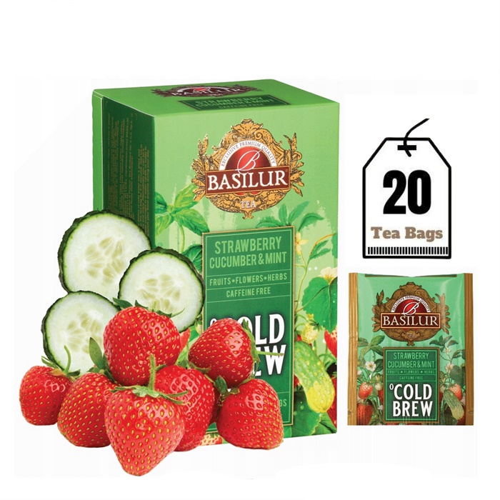 Bahan-bahan:(Strawberry Cucumber & Mint) Buah Rosehip, Daun Peppermint, Daun Spearmint, Bunga Raya, Buah Timun, dan perisa strawberi dan pudina asli.