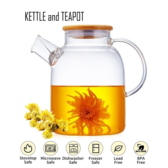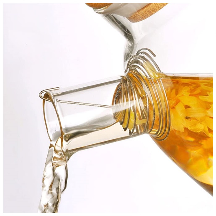 ✅它有一个带硅胶O型圈的竹盖。 壶嘴有一个线圈附件,可以过滤掉水壶内的冰块、大块水果或茶包。