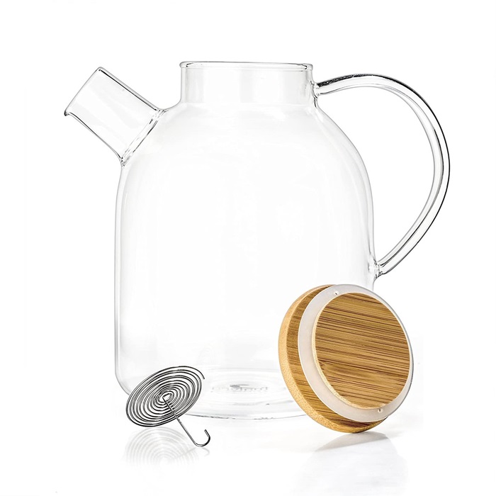 ✅It has a bamboo lid with a silicone O-ring. The spout has a coil attachment that filters out ice, large chunks of fruit or tea bags inside the pitcher.
