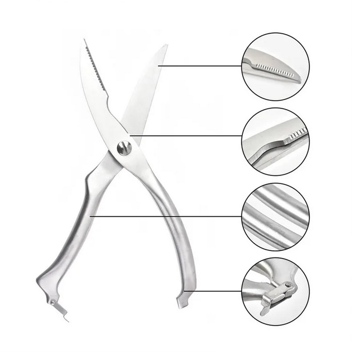 3.多功能厨房剪可以帮助您节省在不同工具之间来回移动的时间,从而提高食物准备效率。 他们不仅会砍骨头、生肉、刮鱼鳞、切菜蔬,还会剥水果、开瓶子。
