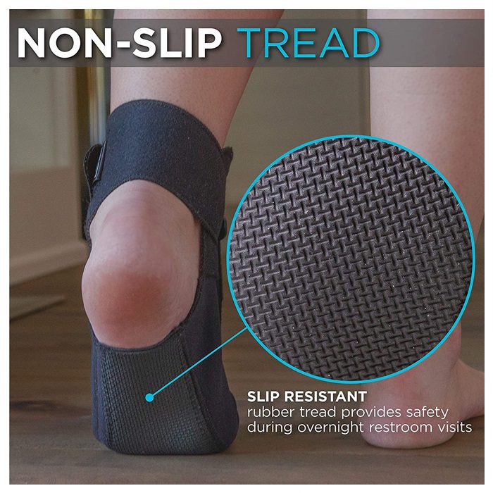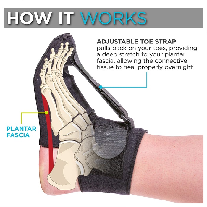 -Perlahan memanjangkan ligamen plantar fascia.Tali fleksi dorsal boleh dilaras supaya anda mengawal jumlah lenturan setiap malam semasa anda membiasakan diri memakainya.