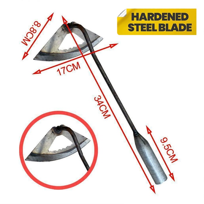 Note: This handmade hoe is very sharp. Protective gloves must be worn during use to avoid injury. In addition, it must not be used for children to play, otherwise it will be very bad