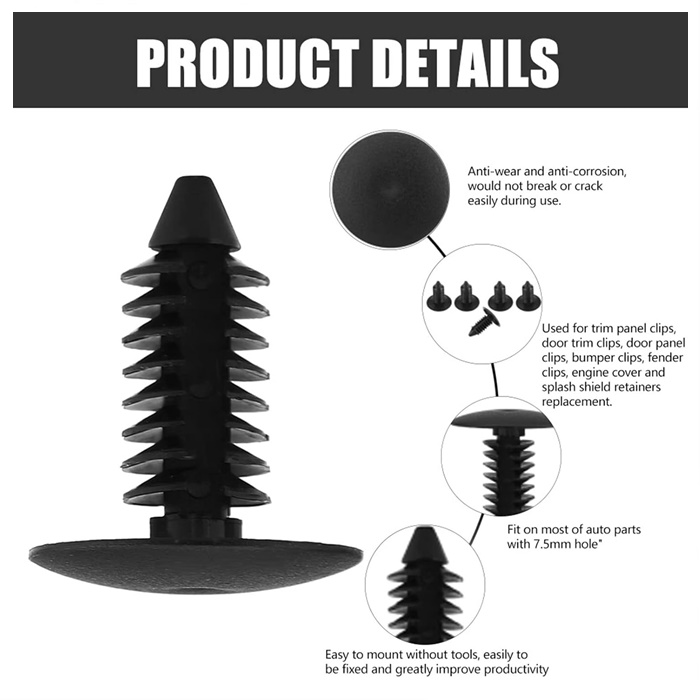 这款100件装多用途汽车卡扣套装采用优质塑料制成,可助您轻松完成汽车保养工作。这些按压式铆钉卡扣设计安装简便——只需按下卡扣头,即可自动膨胀并牢固锁定到位。