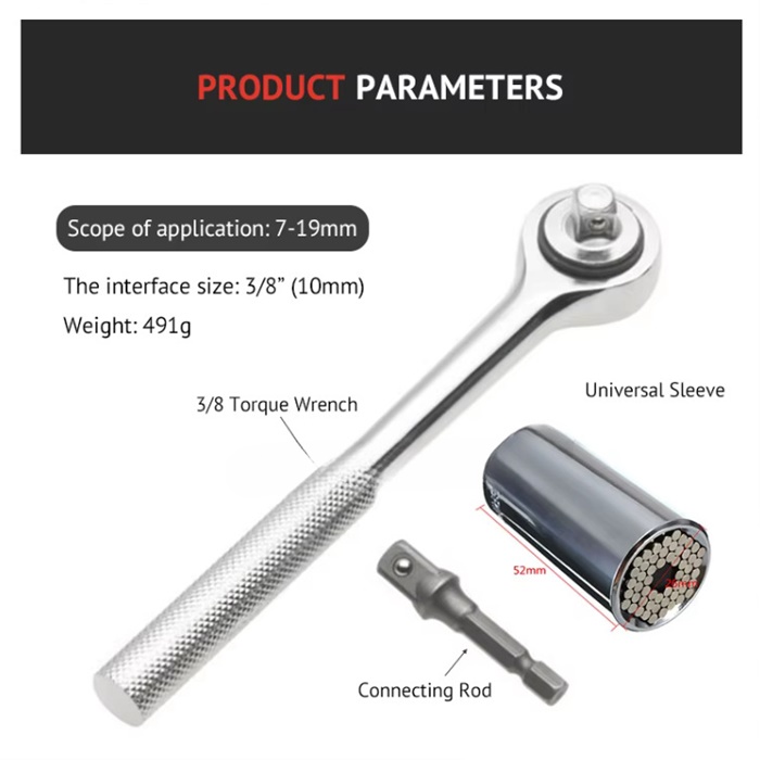 这款多功能通用套筒扳手套装,升级您的工具箱!采用优质碳钢和抛光镀铬表面设计,可自动调节以适应数千种紧固件,是专业人士和DIY爱好者的必备工具。